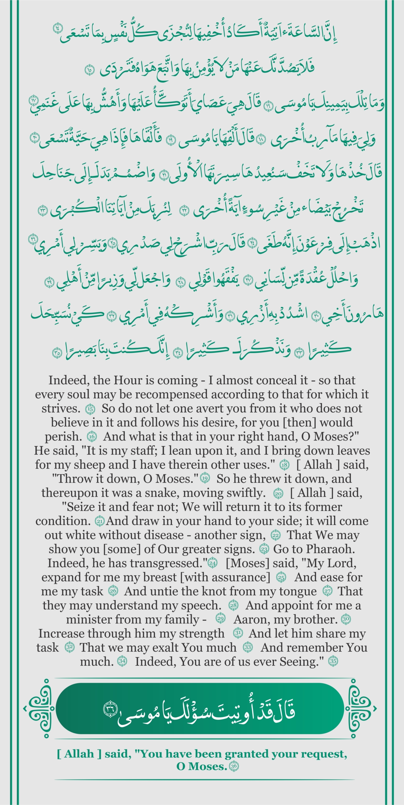 This is one among many verses but this is one of the greatest verses in the Quran where Allah communicates with Moses directly. Without a doubt this is a moment in history where humans civilizWill always remember the communication that took place between the owner of the universe and prophet Moses peace be upon him. The Quran is a book that is critical to the human civilization. People should read the Quran because it is the only book where you will find a communication between God and his creation that took place on Earth where God introduces himself in a communication And with this communication God asks a question to Moses and Moses take this opportunity like any other human being to talk and extended into a conversation which can only be described miraculous.